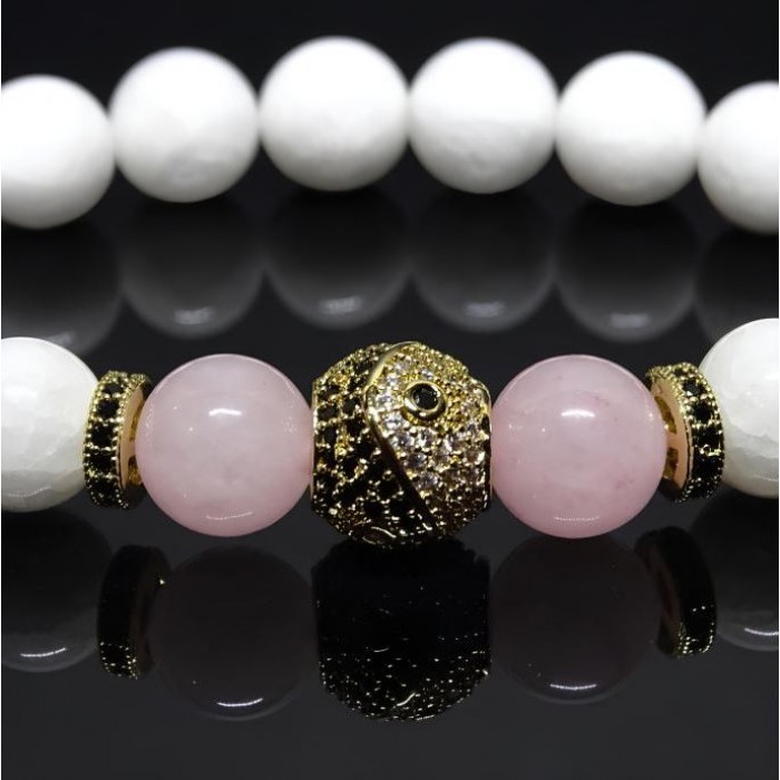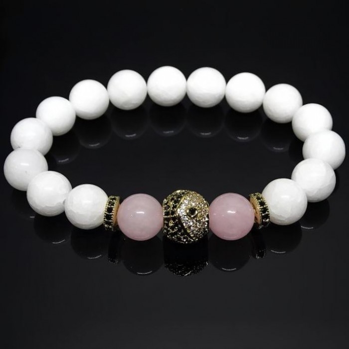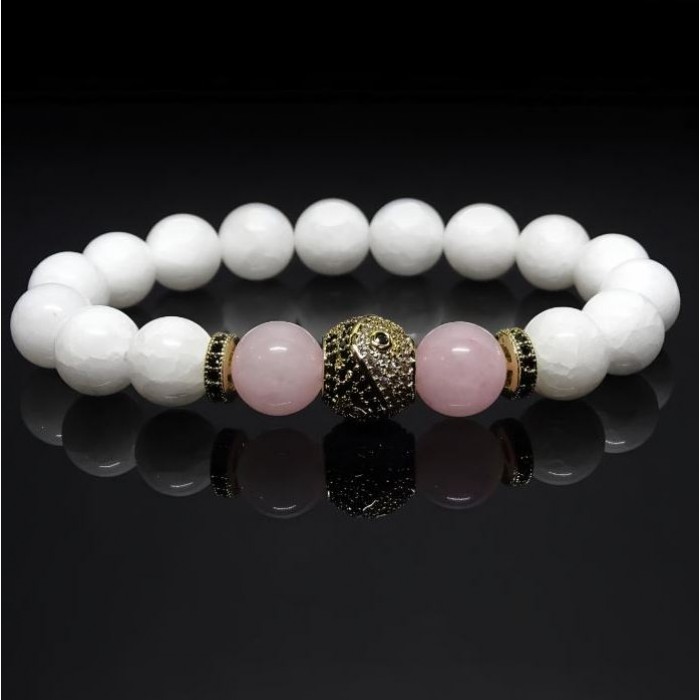Браслет из натурального камня нефрит белый и розовый кварц, N0101, Браслет на резинке