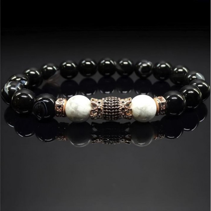 The bracelet is made of 10mm round beads strung on an elastic thread. The main bead materials include:Cacholong – smooth, round beads of a delicate milky white color with characteristic gray veinsBlack glossy agate beads. They give the bracelet a sim..