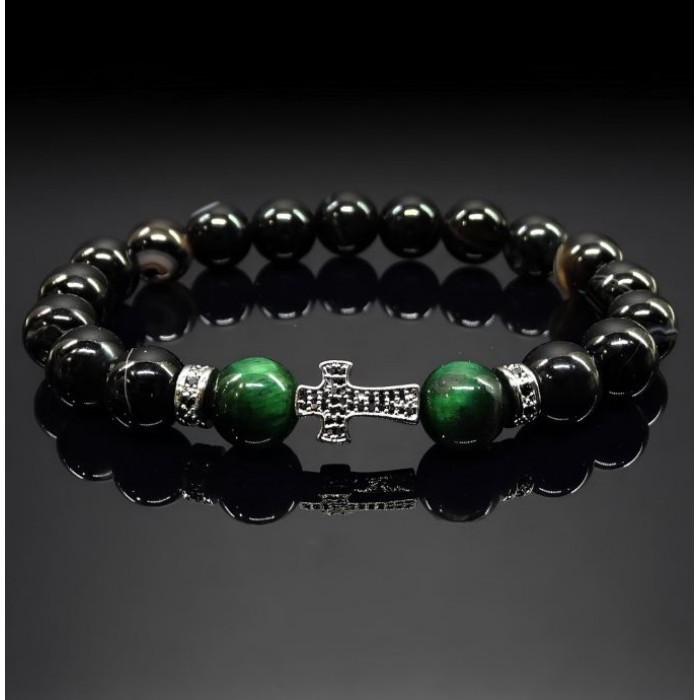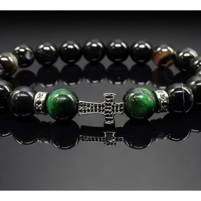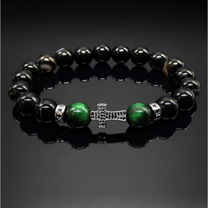 Black glossy agate beads. They give the bracelet a simple and elegant look.