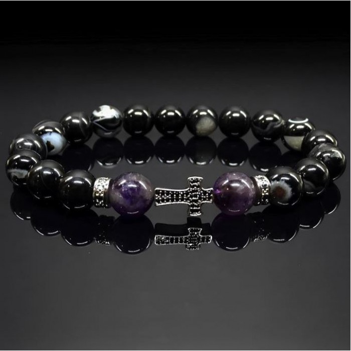 The bracelet consists of round beads strung on an elastic thread.The beads are made primarily of amethyst/black agate, with a diameter of 10 mm.The bracelet's central element is a silver-tone metal piece inlaid with small stones, giving the accessory..