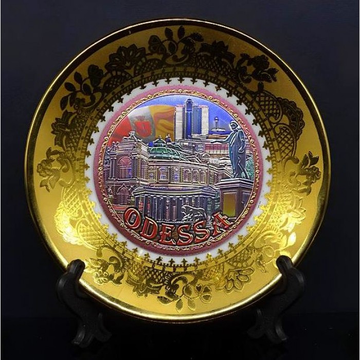 Souvenir plate on a stand, white with gold