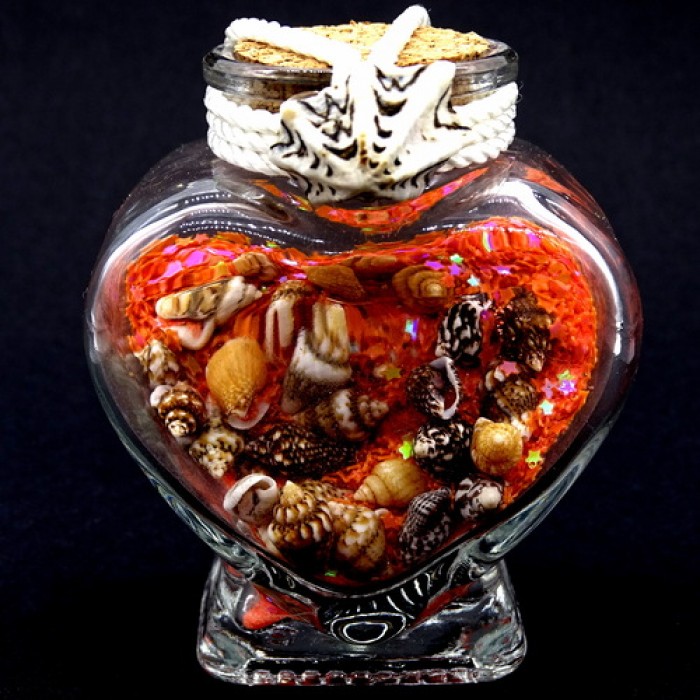 Морський сувенір скляна пляшка у вигляді серця, SU00032, Скляні, колбочки з декором та мушлі