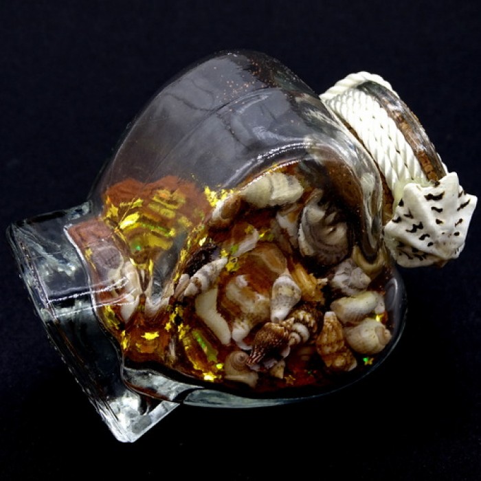 Скляна пляшечка розмір: висота 7 см, ширина 5.7 см, всередині кольоровий пісок з блискітками та натуральна мушлі.