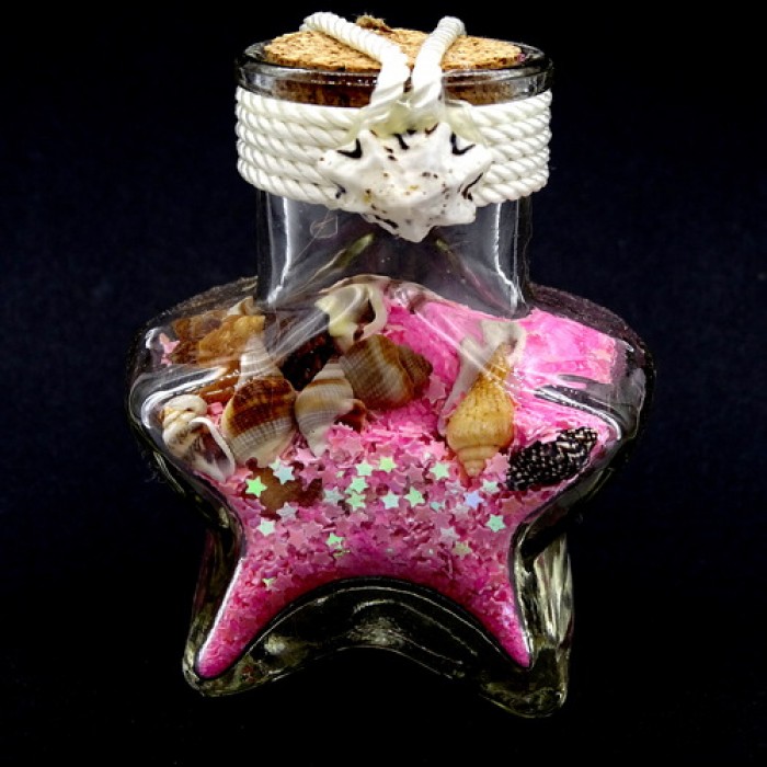 Скляна пляшечка розмір: висота 7 см, ширина 6 см, всередині кольоровий пісок з блискітками та натуральна мушлі.